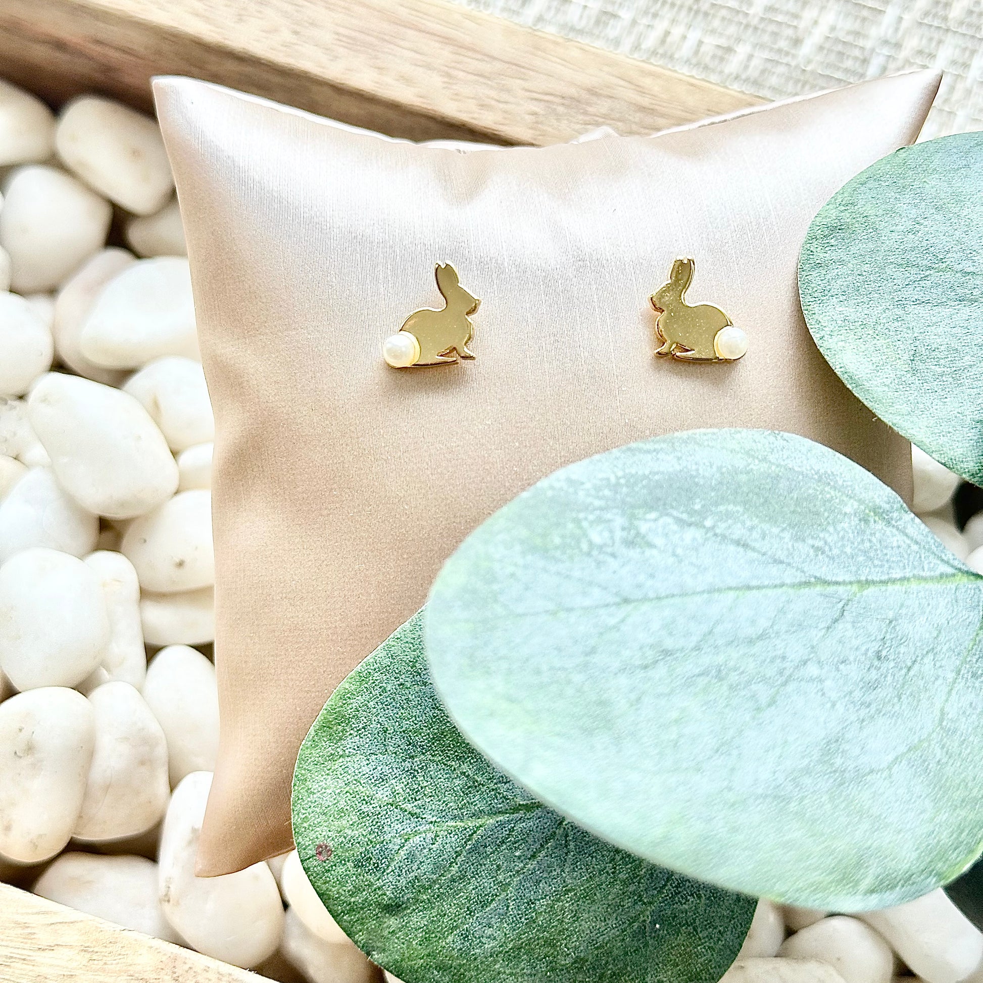 14k gold plated bunny post earrings with pearlite detail for the tail