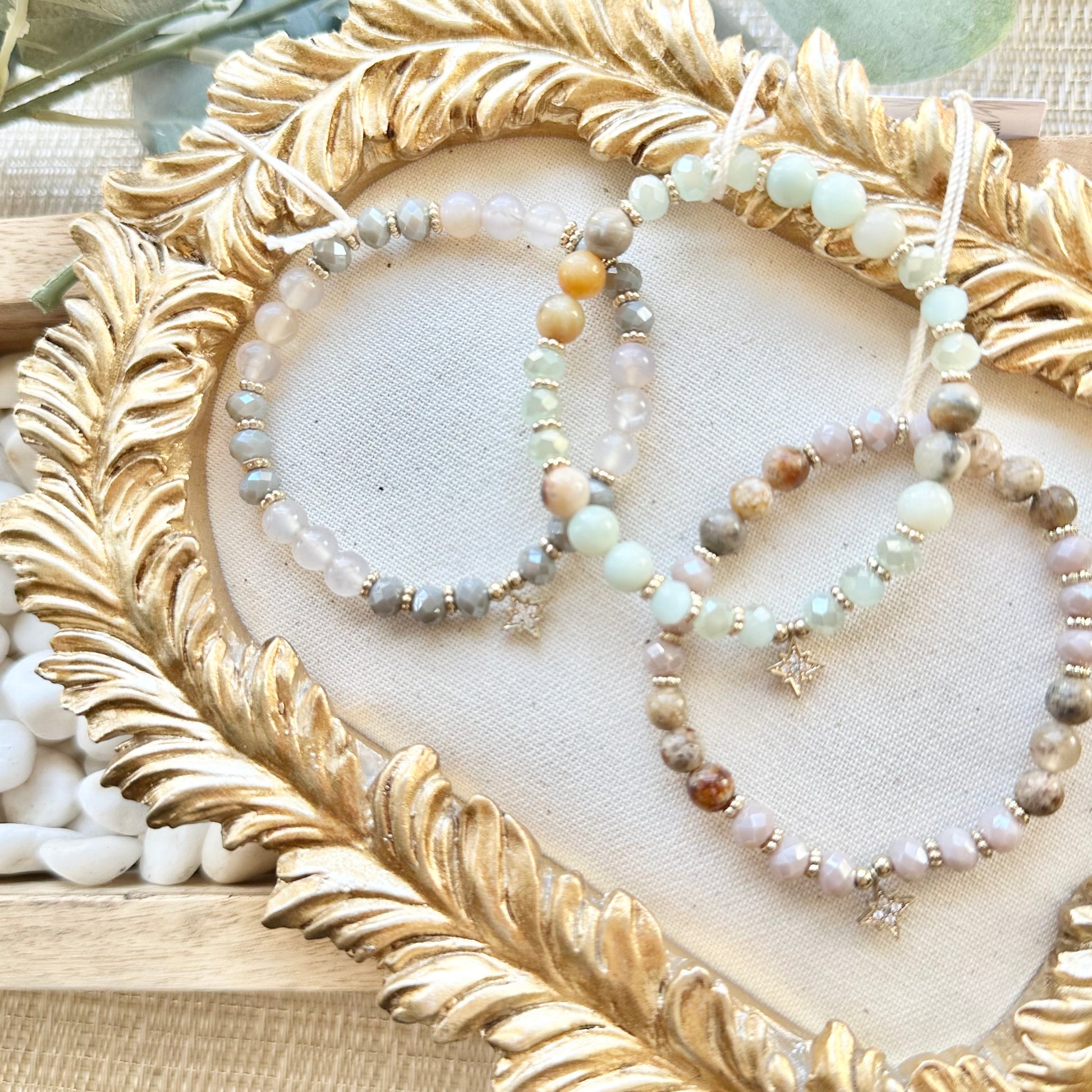 Rose Quartz selection is the light pink and gray bracelet on the left