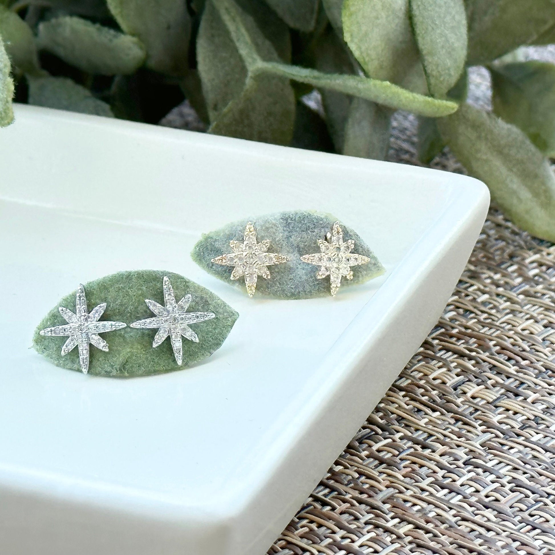 Stud earrings in the shape of a Moravian star with CZ detailing. Gold tone and silver tone, nickel-free metal.