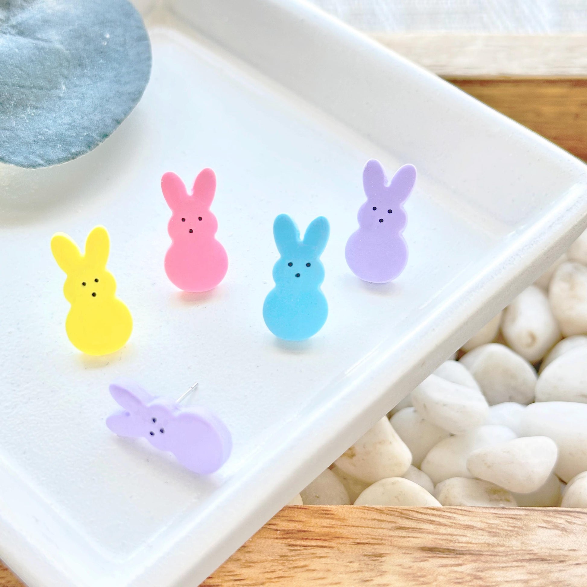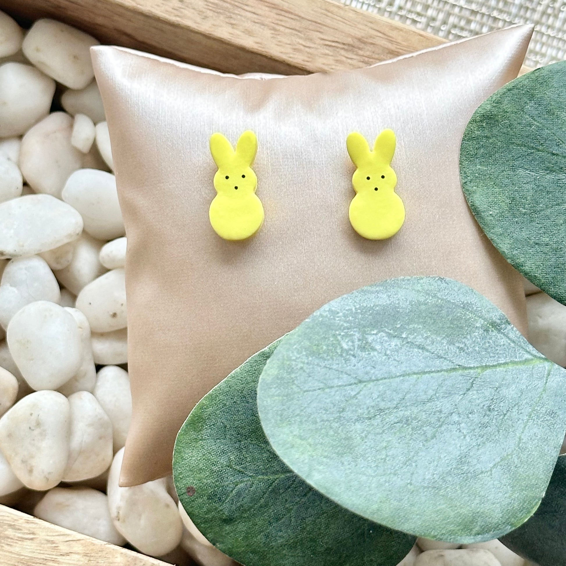 Polymer clay stud earrings in the shape of peeps bunnies.