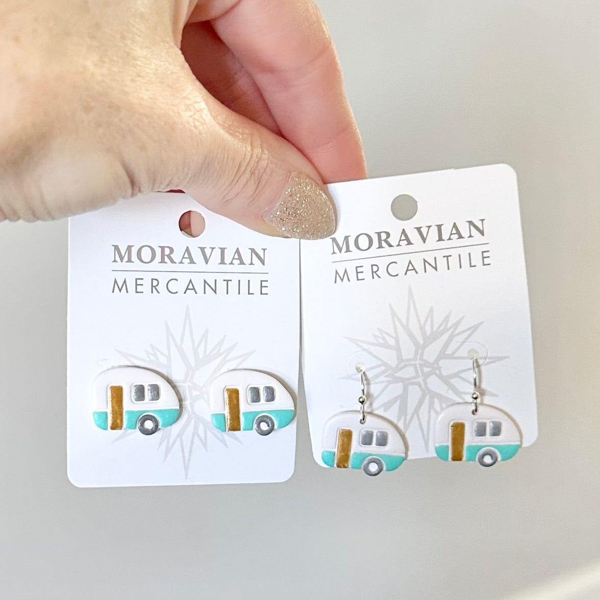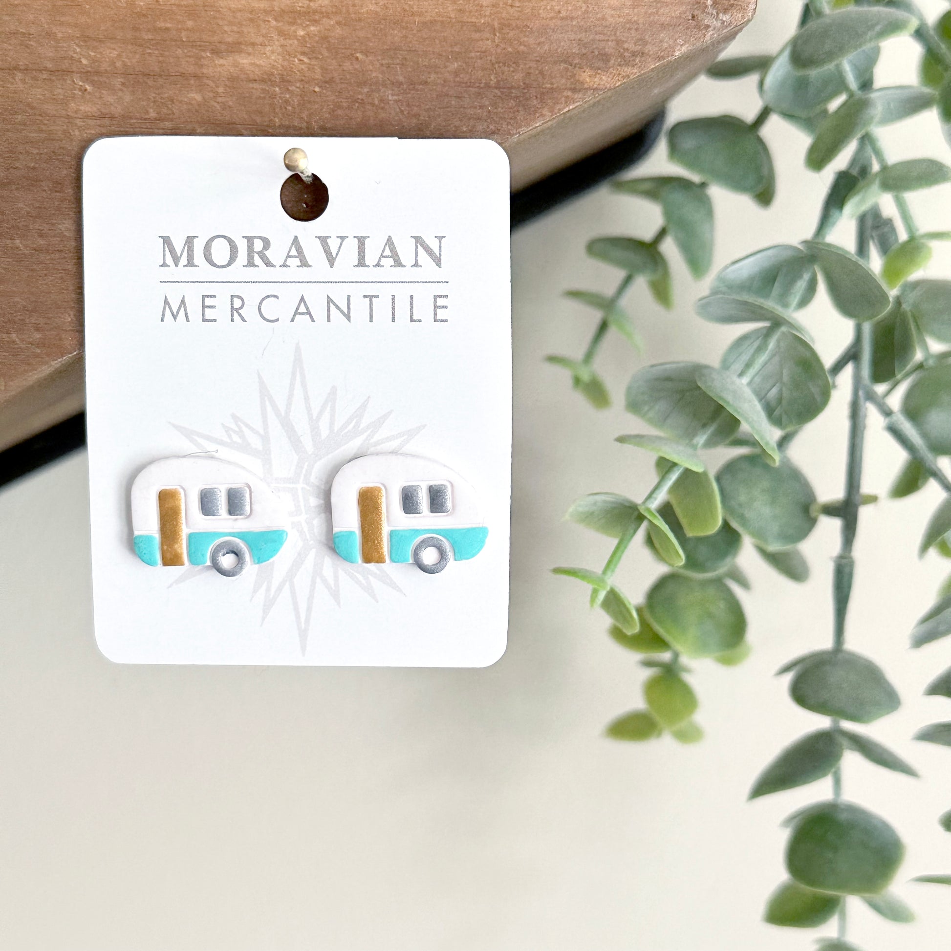 Adorable painted clay earrings in the shape of vintage campers. The camper measures roughly 1/2" tall by 3/4" wide.